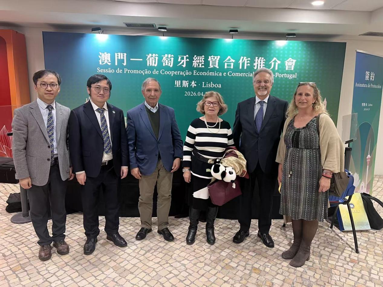 澳科大陳勇副校長(左二)與葡萄牙盧索福尼亞理工學院辦學實體SESC董事會主席Manuel de Almeida Damásio(左三)及董事會成員Maria da Conceição Ferreira Soeiro(右三)合影